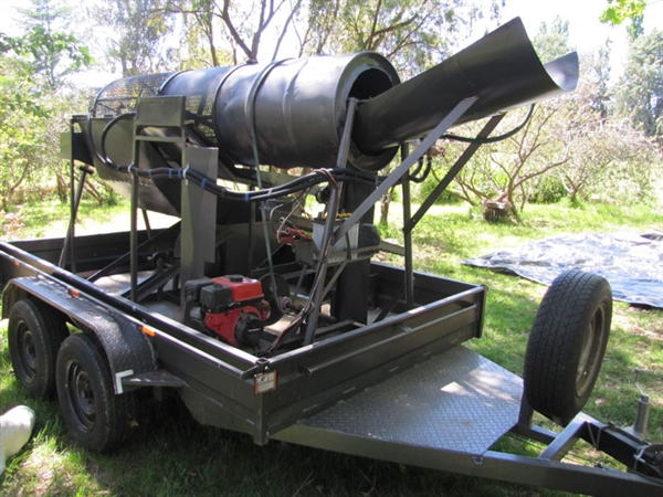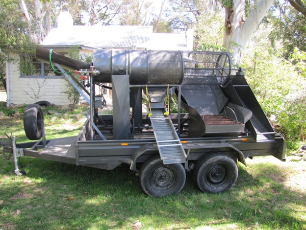 This is mounted on a large almost brand new twin axle fully registered trailer with hydraulic brakes manufactured to the highest standard . Its a beautiful trailer . Spare wheel is front mounted out of the way and there is a large chequer plate storage area over the drawbar for tools /genset etc. The trommel is driven by a 3.5 Hp Mitsubishi petrol engine and is belt driven with a tensioner to adjust belt pressure.